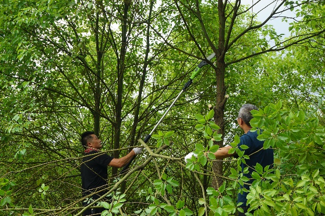 砍伐人员使用高枝锯砍伐油樟树枝叶