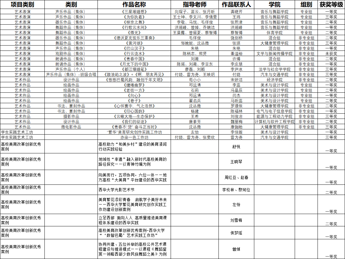 以艺养心,以美育人。8月22日至29日,由四川省教育厅主办的四川省第十届大学生艺术展演活动在成都师范学院举行。从四川省教育厅下发的《关于公布四川省第十届大学生艺术展演活动获奖名单通知》获悉,四川省第十届大学生艺术展演活动收到全省134所高校上报的艺术表演类节目663个,艺术作品559件,艺术实践工作坊91个,美育改革创新案例284份。我校上报作品33项,其中32项获奖,荣获14个一等奖、11个二等奖和7个三等奖。学校获优秀组织奖。