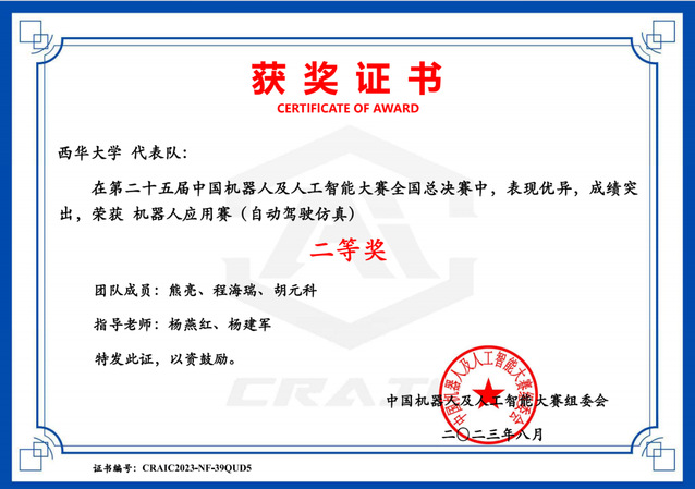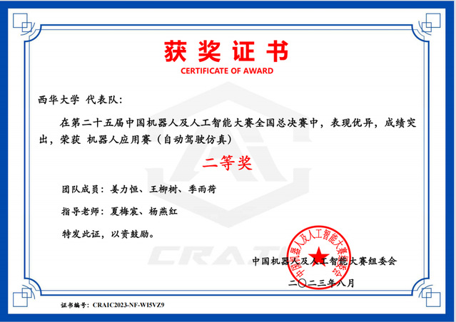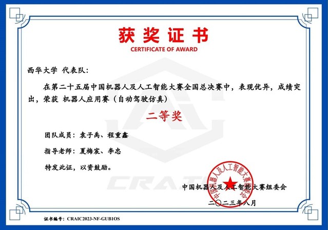 近日,第二十五届机器人及人工智能大赛全国总决赛落下帷幕,此次大赛由人工智能学会、绵阳市人民政府共同主办。由我校汽车与交通学院杨燕红、杨建军两位老师指导,汽车与交通学院熊亮、程海瑞、胡元科三名同学组成的西华大学“岁月如歌”,由我校计算机与软件工程学院夏梅宸老师与汽车与交通学院杨燕红老师指导,计算机与软件工程学院姜力恒、季雨荷和汽车与交通学院王柳树三名同学组成的西华大学“写的代码都对”,由我校计算机与软件工程学院的夏梅宸老师和李忠老师指导,袁子禹和程重鑫两位同学组成的“不知道怎么改才对”在本次比赛中均获得自动驾驶虚拟仿真赛项的全国二等奖,为学校争得荣誉。
