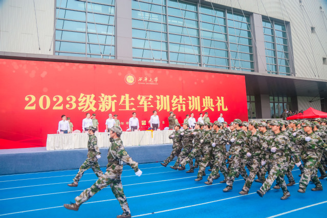 秋风习习,晨光熹微。为期14天的新生军训工作圆满结束,9月26日早晨,宜宾校区在科创中心运动场举行2023级学生军训结业典礼。出席本次典礼的领导和嘉宾分别是,武警宜宾支队大队长付乐少校,副校长许州、费凌,党政办、宣传部、学工部、教务处、后勤服务总公司、宜宾校区党工委负责人和各相关学院负责人,宜宾校区党工委常务副书记陆跃文主持典礼。