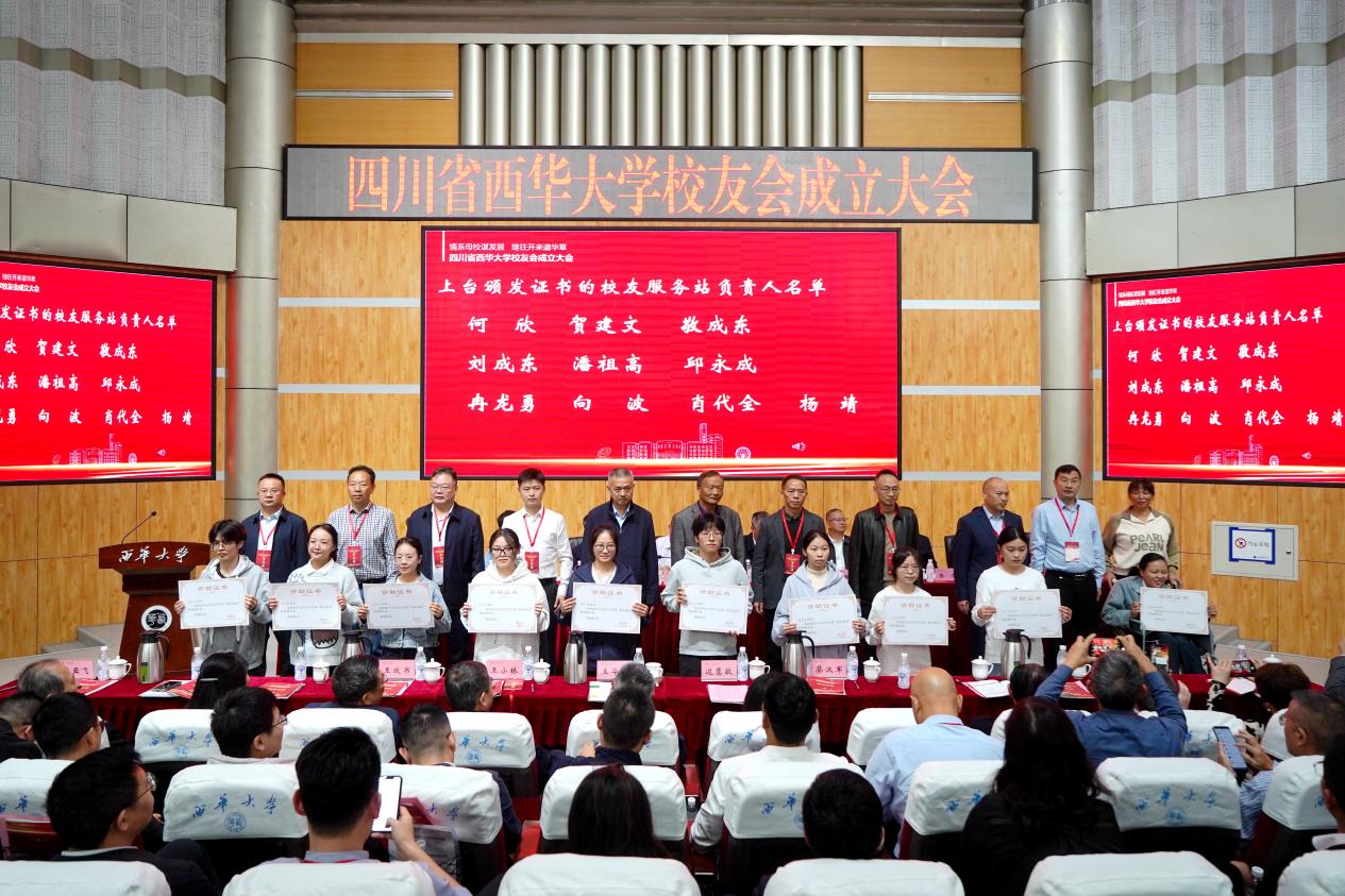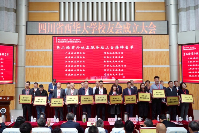 在授牌仪式上,主席台领导分别为24个西华大学省外校友服务站、21个省内校友服务站和2个学院的校友分会授牌。