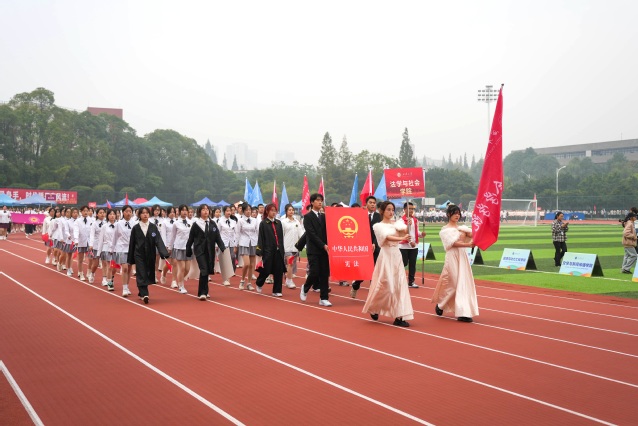 整齐划一,铿锵有力。管理学院踏着矫健的步伐走向主席台,他们坚毅的目光充满不灭的斗志,由数名同学拼起的院徽展现了他们团结一致的比赛精神;英姿飒爽,机械工程学院穿着整齐的服装出场,他们气宇轩昂,展现出青年的坚毅与顽强;舞态生风、青春飞扬,音乐与舞蹈学院以蓬勃的朝气前行,他们用曼妙的舞姿彰显青春活力,舞动青春风采……最后出场的是国际教育学院,来自7个国家的240名国际交流生挥舞着手中的五星红旗和本国国旗,他们将用运动架起沟通的桥梁,用热情点燃友谊之火。少年自有少年强,各学院方队代表队步伐整齐划一,秉持着“比赛第一,友谊第二”的宗旨和“更高,更远,更强”的目标,以独特的方式彰显学院特色,为运动会添上浓墨重彩的一笔。