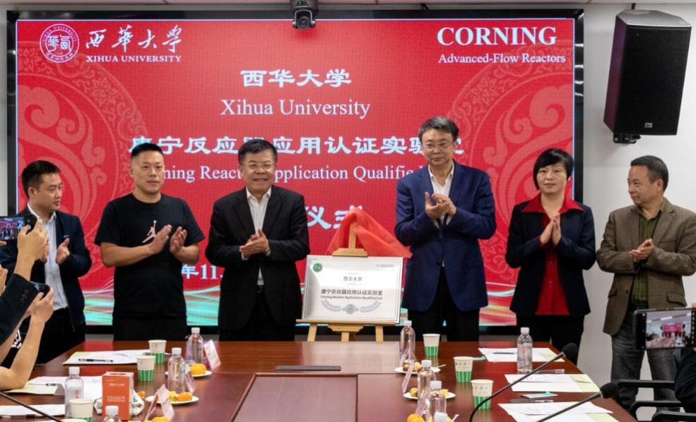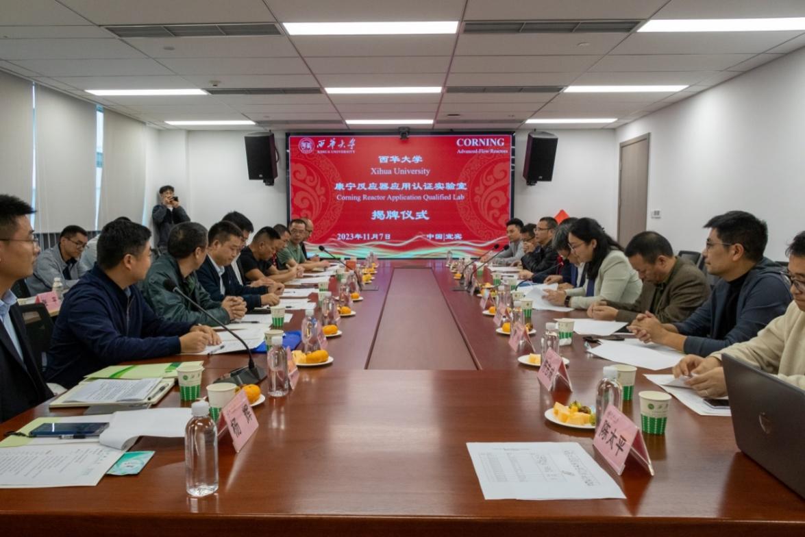 随后,副校长许州和康宁反应器技术有限公司董事长姜毅、宜宾市科技局副局长代德才、宜宾市委人才和大学城工作局调研员李杰、理学院院长王周玉、宜宾西华大学研究院院长郭建军共同为西华大学-康宁反应器应用认证实验室揭牌。
