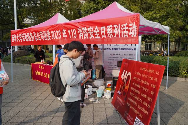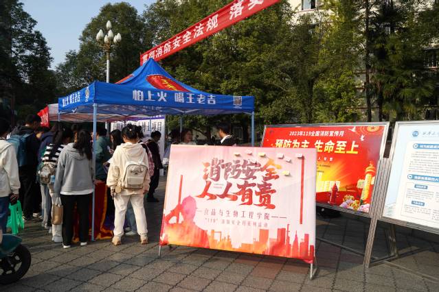 除此之外,学校在明德广场设置了消防安全宣传展,包含消防安全防火知识、马蜂防范、森林防火、防震减灾等主题,来往师生不时驻足观看。来自校团委、食品与生物工程学院、建筑与土木工程学院、后勤服务总公司的青年志愿者通过消防安全有奖知识问答、分发消防安全提示卡、消防小游戏等互动,吸引同学们参与消防宣传活动,在娱乐的同时增强消防安全意识。