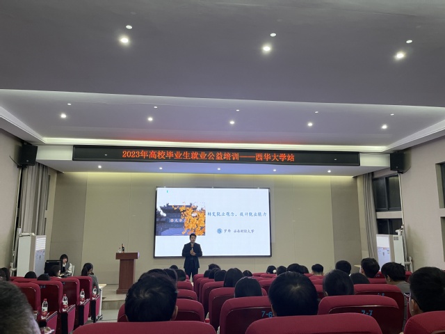 为深入学习贯彻习近平新时代中国特色社会主义思想,引导高校毕业生树立正确的就业观念,提升自身的就业能力,10月25日,由成都市人力资源和社会保障局、成都市人才服务中心主办,西华大学承办的2023年高校毕业生就业公益培训巡回讲座(第八期)在我校郫都校区举行。招生与就业处负责人及136名学生代表现场聆听了讲座。