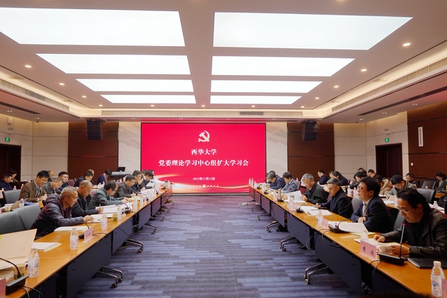 11月15日下午,学校党委理论学习中心组扩大学习会在郫都校区办公楼101会议室举行。会议围绕“深入学习贯彻习近平文化思想,扎实推进‘时代新人铸魂工程’”进行专题研讨交流,认真学习贯彻习近平总书记对宣传思想文化工作重要指示精神和全国全省宣传思想文化工作会议精神,进一步增强文化自觉、坚定文化自信。全体校领导,机关业务单位主要负责人,各学院书记、院长参加会议。校党委书记刘树根主持学习会。