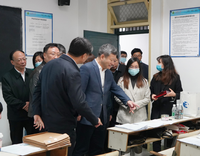 曹立军一行来到招生与就业处,查看了学校将举行的春季第3场双向招聘会现场筹备情况,听取了学校关于应届高校毕业生就业工作情况的汇报,详细询问了学校最受用人单位欢迎的专业、毕业生去向等情况。曹立军一行还来到招聘现场,观摩校园招聘会,与招聘单位交流。