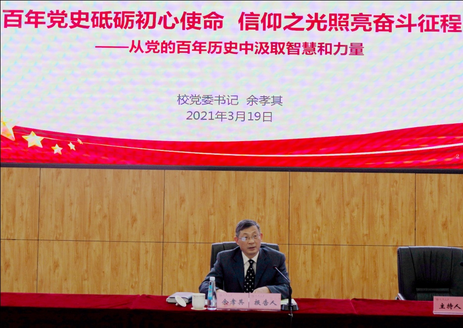 3月19日,校党委书记余孝其以《百年党史砥砺初心使命 信仰之光照亮奋斗征程》为题,讲了一堂生动、深刻、精彩的专题党课。校领导班子成员,副处级及以上领导干部和全体教工党支部书记参加大会并认真聆听了专题培训的第一堂党课。在党课中,余孝其带领大家回顾了党的历史,结合学校工作,围绕“为什么要学习党的历史,从党的历史中学习什么,用什么来检验学习成效”三个方面作了深刻阐述。