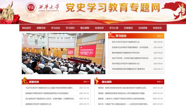 3月24日,西华大学党史学习教育专题网站正式上线,专题网站包含“部署安排”“学习动态”“学习资料”“理论阐释”“支部风采”“学习心得”“先锋模范”“在线课堂”“悦读党史”九个栏目,全方位展示学校党史学习教育工作进展、各类学习教育活动和丰富的学习资料,是引导全校各级党组织和广大党员增强党史学习教育政治责任感和使命感,宣传展示学校党史学习教育工作动态和成果的重要平台。