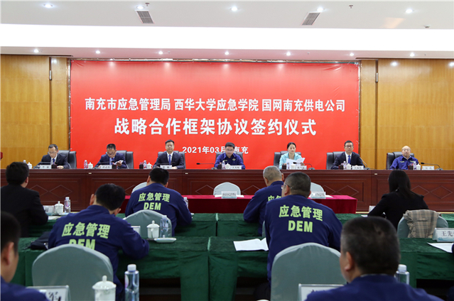 近日,西华大学应急学院与国网南充供电公司、南充市应急管理局签署战略合作框架协议,三方将在人才培养、科技创新、人才交流、教育培训等方面开展深度合作。签约仪式在国网南充供电公司客户服务中心会议室举行,南充市应急管理局党委书记、局长王天配,党委委员、副局长万伦;西华大学应急学院党委书记张雪征,副院长舒志乐;国网南充供电公司总经理、党委副书记唐敏,党委书记、副总经理江泰廷,党委委员、副总经理李敏等出席签约仪式。