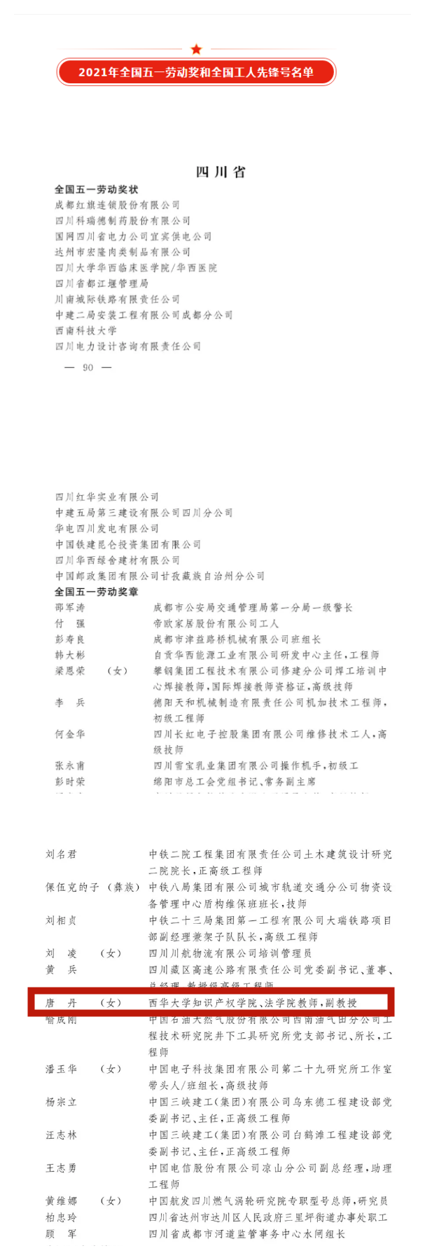 4月27日,中华全国总工会公布了《关于表彰2021年全国五一劳动奖和全国工人先锋号的决定》,知识产权学院、法学院教师唐丹副教授荣获2021年“全国五一劳动奖章”。