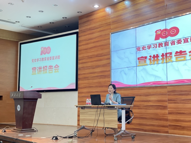 随后,省宣讲团成员、马克思主义学院院长万远英教授受邀作了题为《从党的百年光辉历程中汲取继续前进的智慧和力量》的宣讲报告。学习历史是为了更好地走向未来,了解历史才能看得更远,理解历史才能走得更远。万远英围绕习近平总书记在党史学习教育动员大会上的讲话,阐释了在全党开展党史学习教育的重大意义;围绕学好用好党史基本著作,以中华民族从东亚病夫到站起来、富起来、强起来的历程为主线进行深入浅出地讲解,带领大家回顾了共产党的百年奋斗史;正确认识中国共产党百年奋斗的光辉历程和历史性贡献,深刻感悟中国共产党始终不渝为人民的初心宗旨,深刻把握开展党史学习教育的重点。她表示,开展党史学习教育,要学懂弄通做实习近平新时代中国特色社会主义思想,增强“四个意识”、坚定“四个自信”、做到“两个维护”。