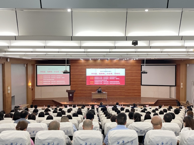 5月13日,学校机关党委在图书馆报告厅1厅举行“汲取党史智慧 凝聚奋进力量”党史学习教育主题党日活动暨宣讲报告会。校党委副书记王政书,副校长费凌,机关各党支部党员、入党积极分子及发展对象190余人参加报告会。