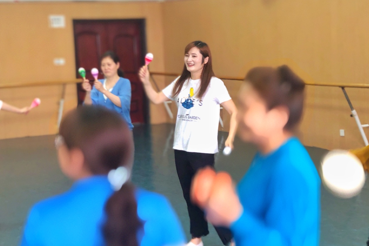 舞动治疗师冯与兮让大家先聚拢成为一个圈,问道:“关于“柔软”,你们会想到什么?”“流水”“女性”“舒服”……老师们给出了各种答案,并表达了对本次工作坊的期待。冯与兮引导大家从关注呼吸开始,闭上眼睛感受自己的身体,在颂钵中逐渐放松下来。紧接着,每个人在手鼓、雨棒、小钟琴等丰富多样的乐器中任选一样,跟着音乐的节奏,用乐器演奏出声音,并在团体中找到共同的节奏,在同频中,原本彼此陌生的团体开始变得亲近。冯与兮再带领大家通过骨盆带动全身舞动,挖掘自身女性的核心能量,在团体中体验和传递柔软的力量。