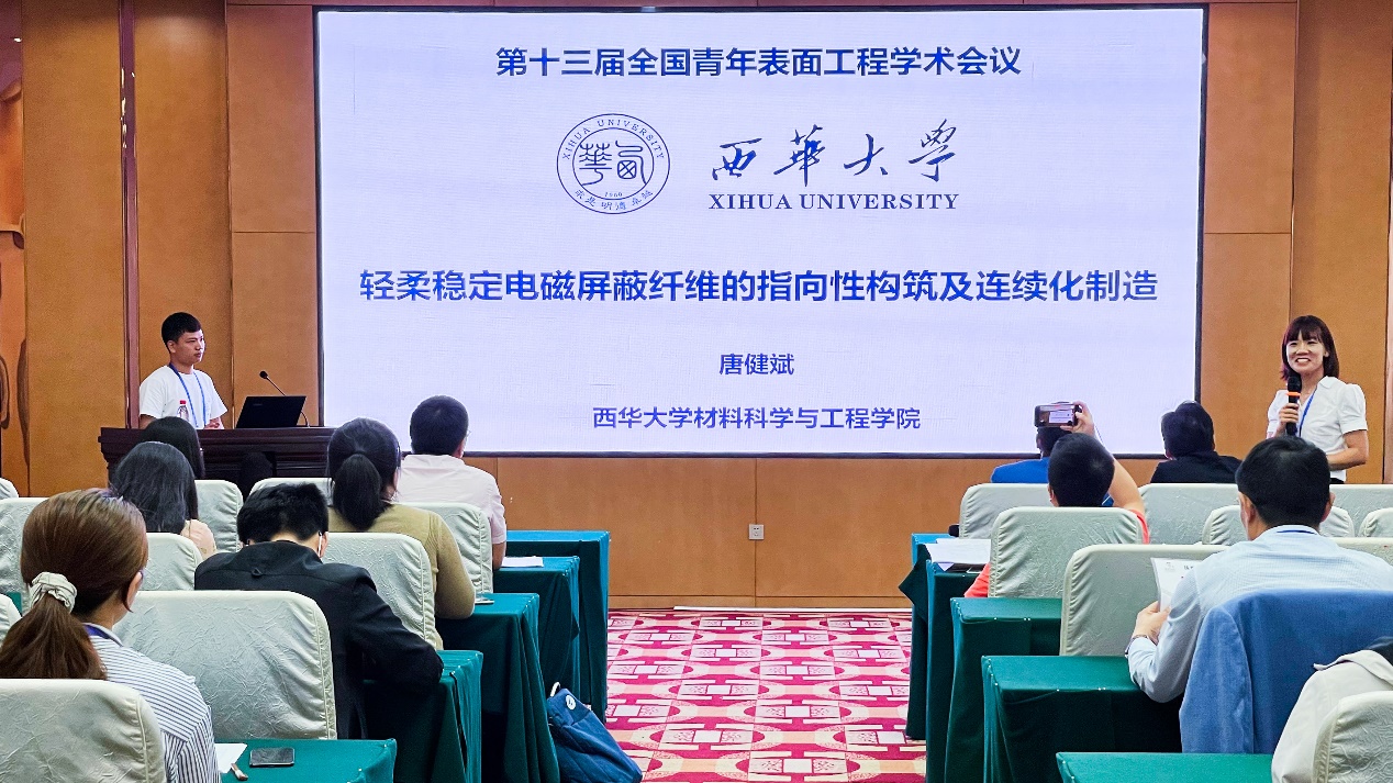 16日下午,我校材料科学与工程学院硕士研究生唐健斌在本次大会分会场作了题为“轻柔稳定电磁屏蔽纤维的指向性构筑及连续化制造”学术报告。报告主要针对我国空天国防等特殊领域轻质、柔性、高强、稳定的屏蔽纤维制造难题,分享了课题组最新成果——以轻柔高强纤维为芯材的“叠层”复合纤维,针对连续化制造过程中的关键科学问题提出了独有的设计思想与解决方案,并展示了自主研发的产线。同时,唐健斌分享了发表于Surface & Coatings Technology国际期刊上的最新研究成果。在提问环节,会场反响热烈,与会人员针对报告内容进行提问,唐健斌认真回答,并就学科热点问题与专家深入交流。