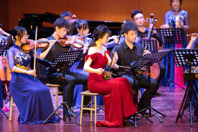 音乐会在经典民乐合奏曲《渔歌》中拉开序幕,其轻松悠长的曲调为现场营造出从容舒展、热情明快的氛围。一带一路中西联,山河锦绣大地新。一首《天山之春》用琵琶热情奔放的旋律,生动地描绘了天山春天的秀丽风光和维吾尔族人民在天山脚下载歌载舞的节日欢庆场面。弦乐重奏《唱支山歌给党听》抒情的音乐从内心深处表达出对党的热爱与感恩之情。《弹起我心爱的土琵琶》是一代中国人心中的红色记忆,而巴扬重奏的方式更是让其曲调变得轻快流畅,将游击队员们用坚强的意志和乐观的精神,在纵横数百里的铁路干线上创造的一个又一个震撼人心的传奇故事展现得淋漓尽致。二胡协奏《蒙风》则是一首传统与流行、东方与西方结合的二胡现代作品,其乐曲以内蒙音乐风格为基调,乐曲粗犷豪爽的风格、悠长抒情的长调旋律,以及模仿马头琴的演奏手法将蒙古草原上一幅幅美丽的画面和一个个动人的场景展现在听者面前。