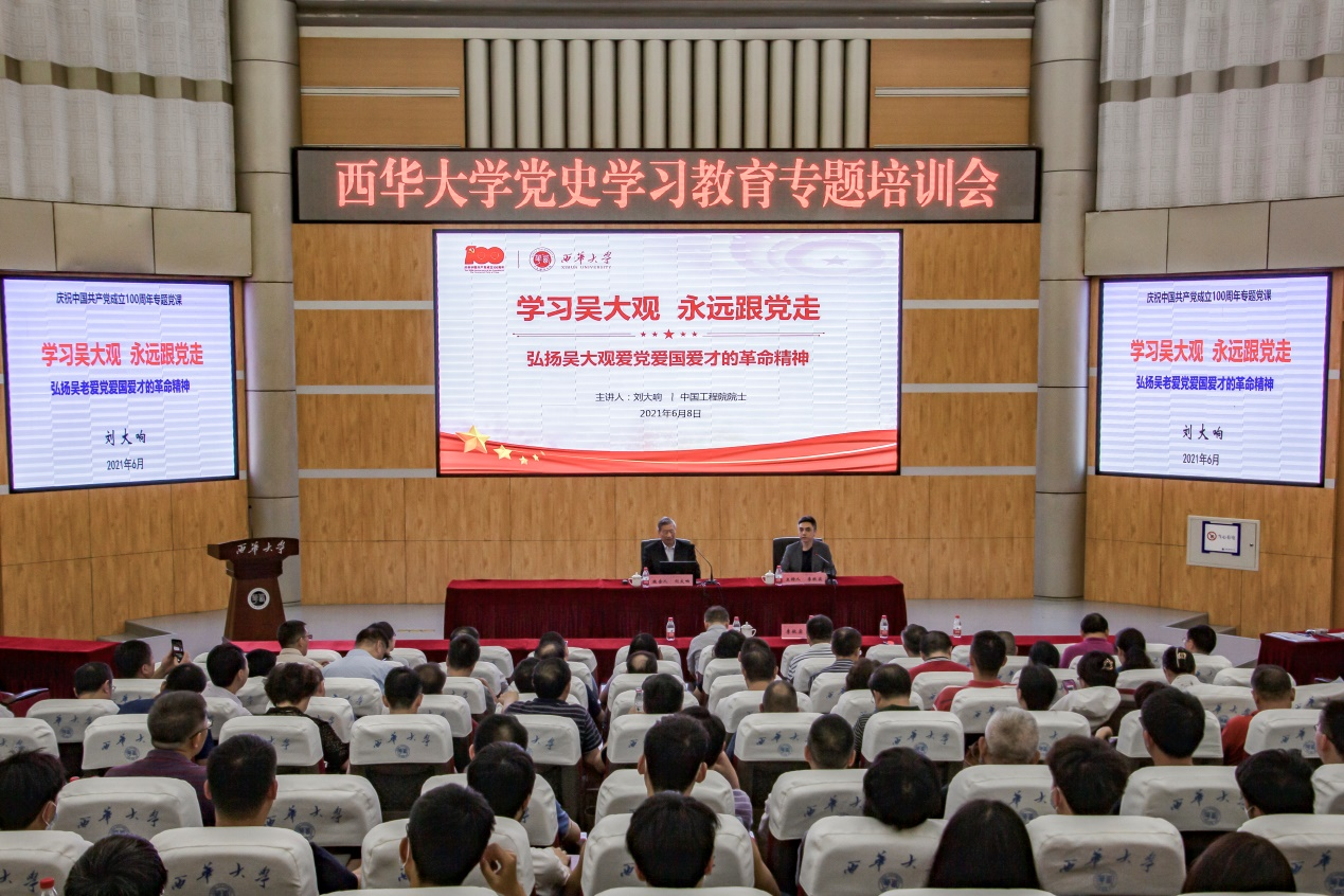 6月8日,为深入推进党史学习教育,充分发挥先进典型的示范引领和带动作用,激励党员干部师生继承和发扬革命精神,将爱国爱党热情转化为实际行动,学校在四教报告厅举行了党史学习教育专题培训会,邀请中国工程院院士刘大响来校作题为“学习吴大观 永远跟党走——弘扬吴大观爱党爱国爱才的革命精神”的专题报告。学校领导、副处级及以上中层干部和航空航天学院师生代表聆听了报告。副校长李秋实主持培训会。