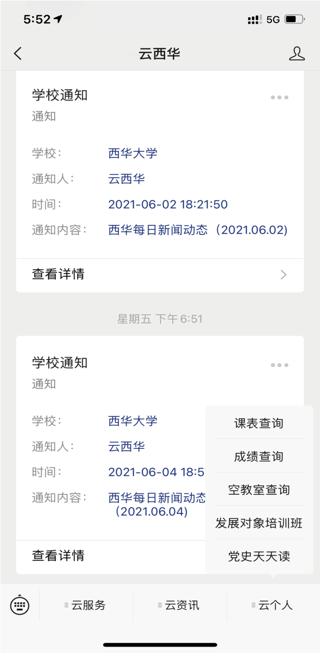 点击“云西华”微信公众号“云个人”栏目查询空教室