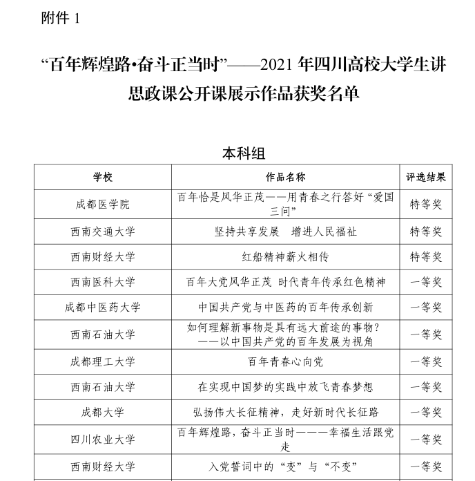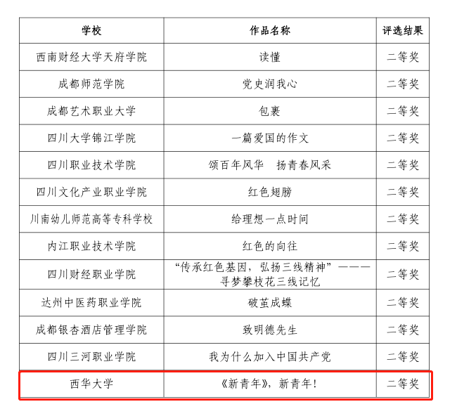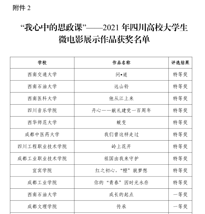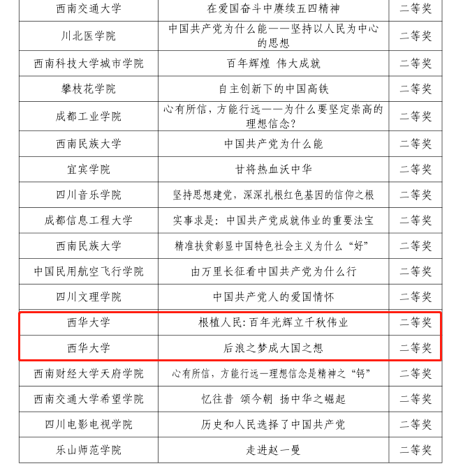 经过四川省教育厅评选,最终,我校马克思主义学院彭翛雅等学生团队的展示作品《根植人民:百年光辉立千秋伟业》、管理学院范圆圆等学生团队的展示作品《后浪之梦成大国之想》荣获“百年辉煌路•奋斗正当时”——2021年四川高校大学生讲思政课公开课展示作品二等奖。食品与生物工程学院袁濛等学生团队的展示作品《<新青年>,新青年!》荣获“我心中的思政课”——2021年四川高校大学生微电影展示作品二等奖。