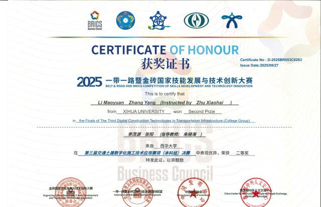 近日,第三届“一带一路” 暨金砖国家技能发展与技术创新大赛全国总决赛落下帷幕。我校汽车与交通学院学子在大赛交通赛项中表现亮眼,获全国一等奖、二等奖各1项。