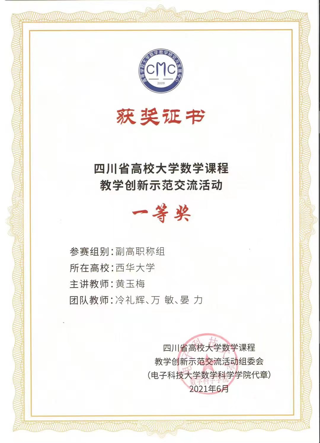 近日,在首届四川省高校大学数学课程教学创新示范交流活动中,理学院教师黄玉梅代表《概率论与数理统计》课程教学团队参赛,在通过网络评审进入现场评审后,一路过关斩将,最终夺得副高组一等奖,并获得唯一代表四川省参加全国副高组比赛的资格。