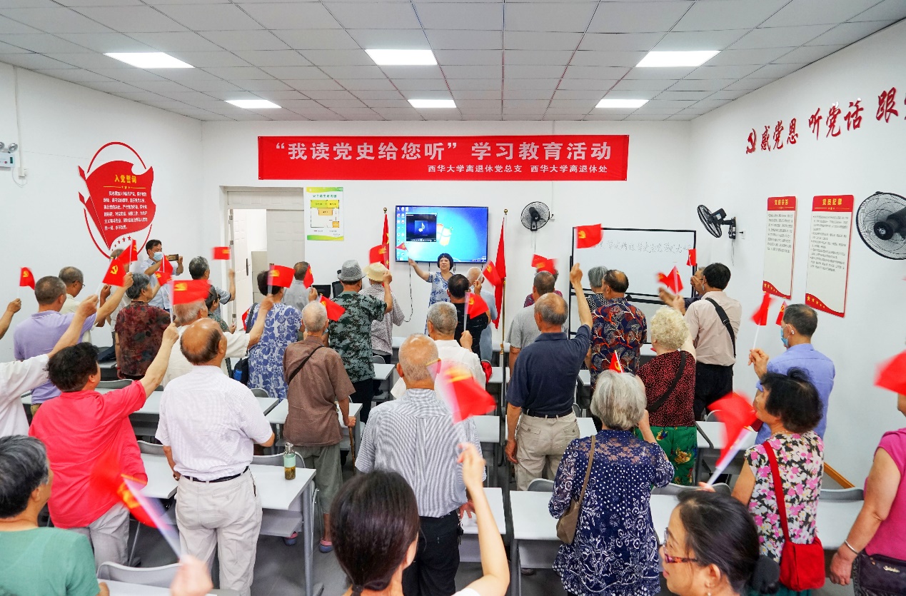 学习教育活动场面十分感人,有白发苍苍坐着轮椅、拄着拐杖的老同志,有步履蹒跚、身体羸弱的老同志,有气喘吁吁、带着氧气管的老党员,有父母与子女同场同桌、有老夫老妻相扶相携……他们的神情是那样的专注、认真。学习教育活动中党支部书记带头朗读党史,老干部、老专家、老党员积极参与朗读党史,他们用洪亮清晰、字正腔圆的声音、饱满的情绪展开了一幅幅中国共产党历经磨难、走向辉煌的历史画卷,赢得了一阵阵掌声。每场学习教育活动临结束时,大家齐声高唱《没有共产党就没有新中国》,铿锵有力的现场指挥,一面面舞动在手中的鲜红党旗,抒发了老党员、老同志们听党话、感党恩、跟党走的激情与决心,把学习教育活动推向高潮。