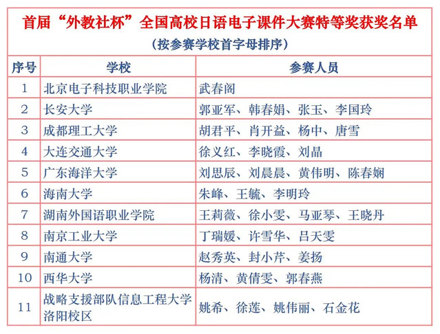 为推进多媒体网络技术辅助高校日语专业教学,教育部高等学校外国语言文学类专业教学指导委员会日语分委员会、中国日语教学研究会和上海外语教育出版社联合举办了首届“外教社杯”全国高校日语电子课件大赛,比赛于2021年3月正式启动,历经五个月的初赛、决赛阶段,最终有74组参赛选手进入决赛。我校外国语学院教师杨清、黄倩雯、郭春燕组成的团队突出重围,最终斩获本次大赛全国特等奖。