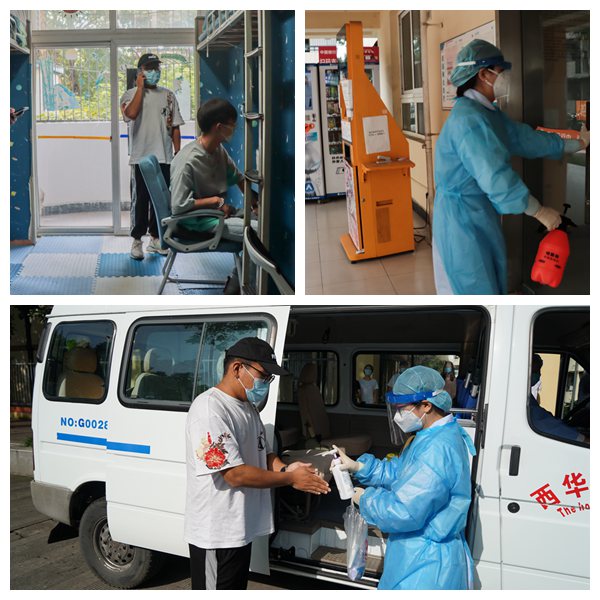 在寝室出现发热病人场景演练中,发热同学将情况报告辅导员并拨打校医院值班电话,校医院电话联系该生,追问流行病学史做好登记,安排救护车前往发热学生寝室将其送至定点医院发热门诊进行处置,并做核酸检测。校医院对发热学生寝室和救护车进行消毒并做好消毒记录。核酸检测结束后,救护车将发热学生转移至学校隔离点等待核酸结果并进行医学观察和治疗。发热学生核酸结果未出来前,要求同寝室同学减少非必要外出,若出现发热等异常情况立即报告。
