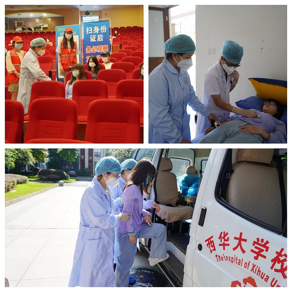 在疫苗接种异常反应场景演练中,留观区负责巡逻的医生发现一名同学出现头晕等异常反应,立即通知现场其他医务人员将其转移至异常反应处置区,医务人员询问相关反应并记录学生相关信息,将该生转移到异常反应处置区进行救治。出现医务人员不能处理情况时,立即安排救护车转移到定点医院进行救治。
