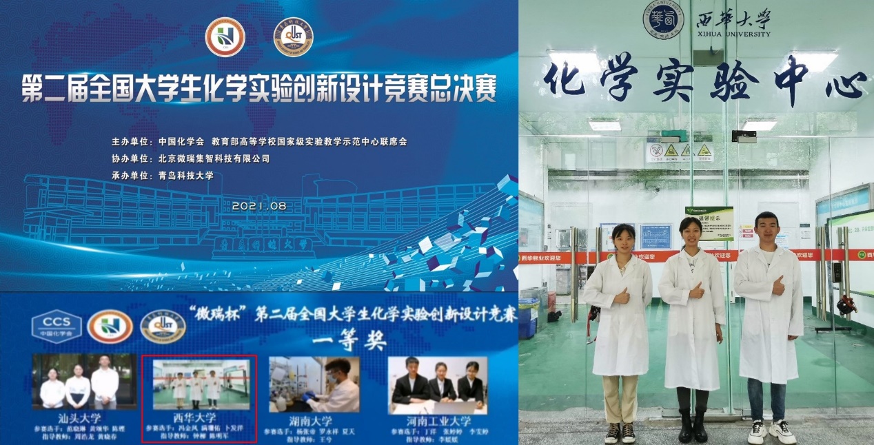 8月25-27日,第二届全国大学生化学实验创新设计竞赛全国总决赛在青岛科技大学举行。该竞赛由中国化学会、教育部高等学校国家级实验教学示范中心联席会主办,青岛科技大学承办。我校理学院化学专业2018级本科生冯金凤、满珊佑、卜发洋,在陈明军教授和钟柳副教授的指导下,以西南片区赛一等奖的身份获得参加全国总决赛的资格,并在全国总决赛中荣获一等奖。