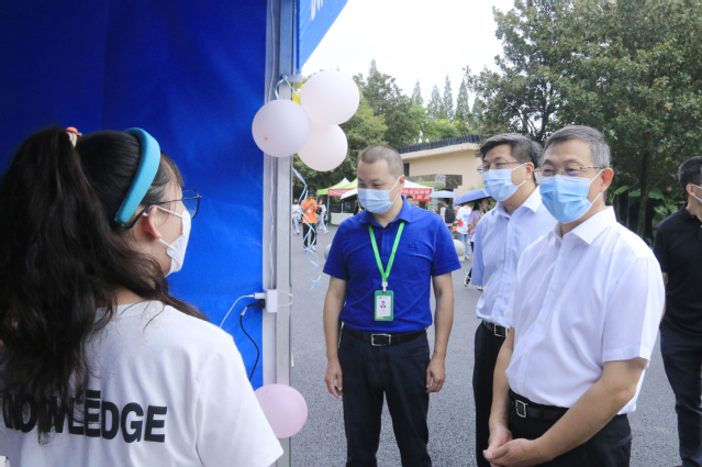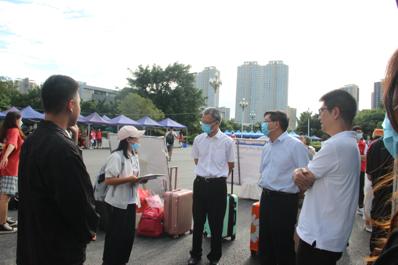 迎新第一天,学校领导带领相关部门负责人来到迎新工作第一线,看望2021级新生,慰问迎新工作人员,了解迎新工作情况。在迎新现场,校领导与新生亲切交谈,询问他们来到学校的感受,希望新同学们尽快熟悉校园环境,融入大学生活,嘱咐同学们要认真规划大学生活,好好学习,努力提升自己。