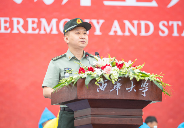 军训承训部队领导、中共成都市金牛区委常委、金牛区武装部政治委员张胜上校讲话,他对学校为军队和国防建设培养了一大批优秀人才表示祝贺,并代表全体教官承诺会严守规定、认真负责,提高同学们的军事素质,培养同学们的拼搏精神和荣誉意识,锻造不怕苦、不怕累的坚韧品质。