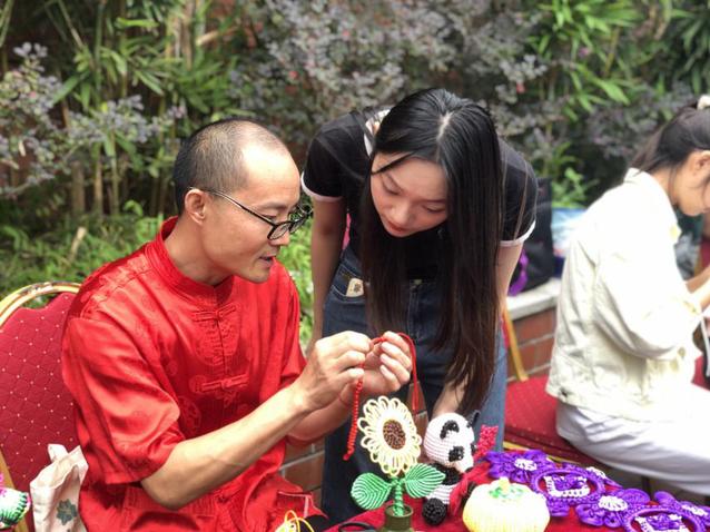 上午,内画传承人吴建英、新繁棕编李兵、蜀绣张正蓉、灌县木雕传承人何飞、道明竹编非遗传承人白秀君、卷纸工艺江学春、绳编传承人杨文艺、非遗“东峰剪纸”第二代传承人绍雷、蝶艺传承人王世宏和金银器工艺大师王波十位非遗传承人将传统手工艺带入校园,让学生们经历了一场精彩的文化体验活动。