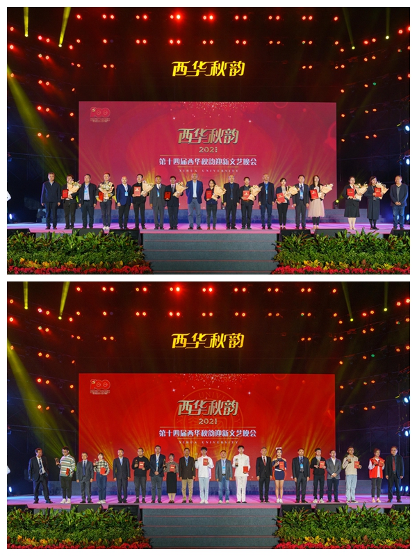 晚会期间,学校举行了隆重的颁奖仪式,对9名国家一流专业和一流课程代表团队教师,11名2020-2021年国家自科基金立项获得者、国家社科基金立项获得者代表,11名指导学生在全国各类学科竞赛和科技创新比赛中获得优异成绩的指导教师,10名2021年度“我最喜爱的老师”和10名2021年度“西华之星”获得者进行表彰。