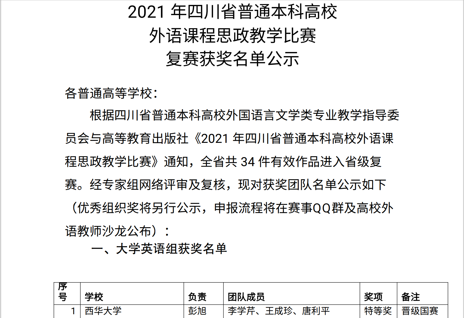 近日,由四川省普通本科高校外国语言文学类专业教学指导委员会与高等教育出版社联合主办,四川省高等教育学会高校外语专业委员会协办,西华大学承办的四川省普通本科高校外语课程思政教学比赛落下帷幕。此项赛事从2021年6月15日启动,分为大学英语组、英语类专业组,历经初赛、复赛最终角逐出特等奖 4 个,一等奖 6 个,二等奖 10个,三等奖若干个。我校教师彭旭、李学芹、王成珍、唐利平组成的团队以第一名的成绩荣获本项赛事四川省区特等奖,并晋级国赛。