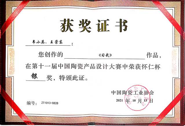 近日,由中国陶瓷工业协会主办、怀仁市人民政府承办、怀仁市陶瓷行业协会和朔州陶瓷职业技术学院协办的第十一届中国陶瓷产品设计大赛在山西怀仁市举行。我校美术与设计学院2018级设计学研究生韦小英和他的导师王崇东教授共同完成的作品《习武》获得本次大赛银奖。