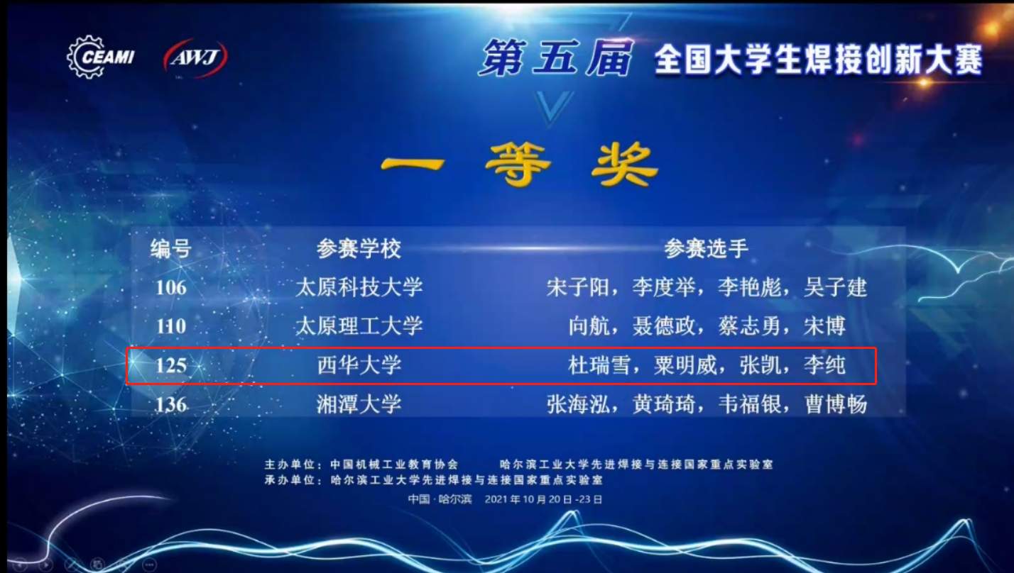 10月20日-23日,第五届全国大学生焊接创新大赛在哈尔滨举行,本届大赛由中国机械工业教育协会和哈尔滨工业大学先进焊接与连接国家重点实验室共同发起和主办。来自清华大学、哈尔滨工业大学、天津大学、西北工业大学、吉林大学、中南大学、西南交通大学、西南石油大学、西华大学等62所高校的220件作品参加决赛,我校首次组织队伍参赛,并最终获得一等奖1项、二等奖1项、三等奖1项的优异成绩。
