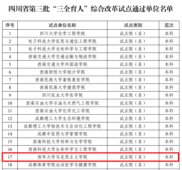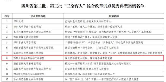 近日,中共四川省委教育工委办公室发布《中共四川省委教育工委办公室关于公布第二批、第三批“三全育人”综合改革试点总结评审结果的通知》(川教工委办函〔2025〕7号),我校食品与生物工程学院、建筑与土木工程学院、马克思主义学院顺利通过评审。其中,食品与生物工程学院提交的案例《强化班导师育人机制,释放综合改革新效能》获评“综合改革试点优秀典型案例”。