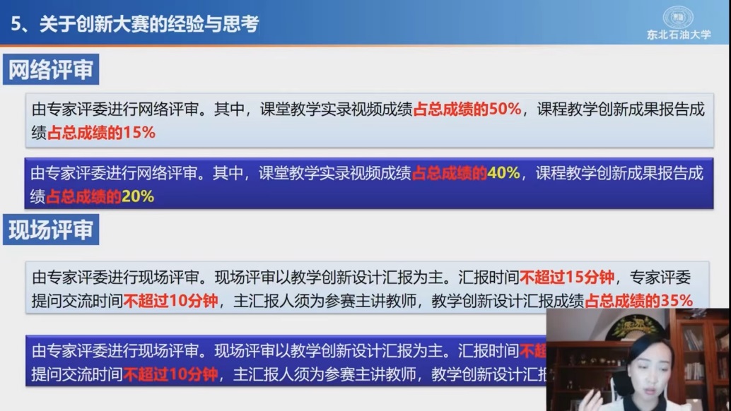 第二场工作坊以“基于教学创新大赛的课程思政教学设计理念及方法(思政融入视角)”为主题,东北石油大学副教授张璐莹紧密结合大赛文件要求,以课程思政的“概念与内涵”为出发点,深入解读了如何在专业课程中融入思政元素来进行教学活动设计,围绕课程教学的目标、内容、方法、现代信息技术与资源运用等方面进行了思政育人元素的挖掘和思政教学融入点的梳理。她以全国首届高校教师教学创新大赛获奖课程、黑龙江省线上线下混合式一流课程《输油管道设计与管理》为例,介绍了基于教学创新大赛的课程思政教学设计理念及方法。