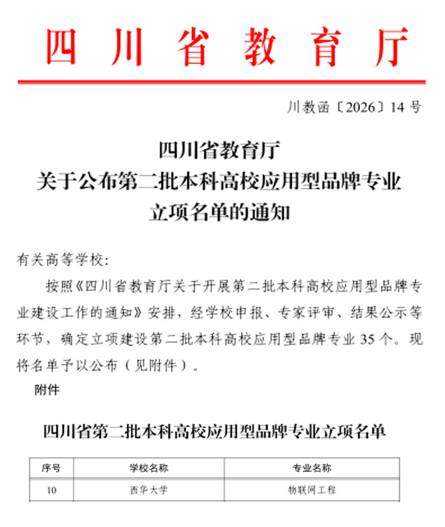 近日,教育厅下发《四川省教育厅关于公布第二批本科高校应用型品牌专业立项名单的通知》,我校物联网工程专业获批为第二批省级应用型品牌专业。截至目前,学校共有省级应用型品牌专业3个。