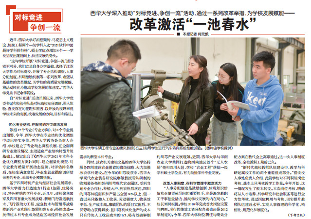 “这与学校开展‘对标竞进、争创一流’活动密不可分,我们立足自身办学基础,选择了江苏大学作为对标高校,开展了专业结构调整、人事分配制度、科研激励机制等一系列改革,希望从基础性的改革做起,为学校的高质量发展赋能,将活动转化为推动学校发展的加速度。”西华大学党委书记余孝其说。