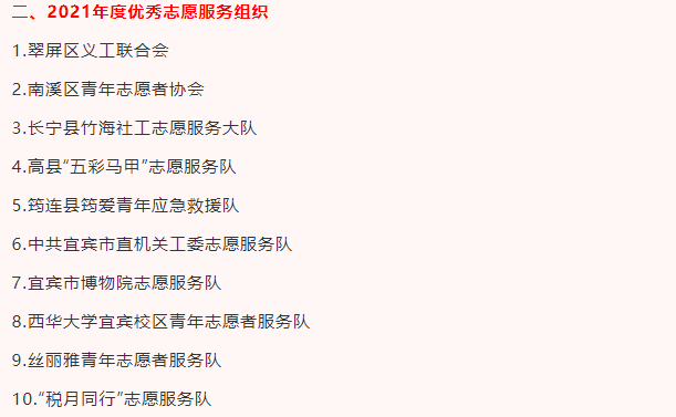 12月3日,根据宜宾市精神文明建设办公室《关于组织开展2021年宜宾市志愿服务先进典型宣传推选活动的通知》(宜市文明办〔2021〕25号)精神,经推荐评审,西华大学宜宾校区青年志愿者服务队成功评选为宜宾市2021年度优秀志愿服务组织,是在宜高校中唯一获得此项荣誉的青年志愿者服务队。