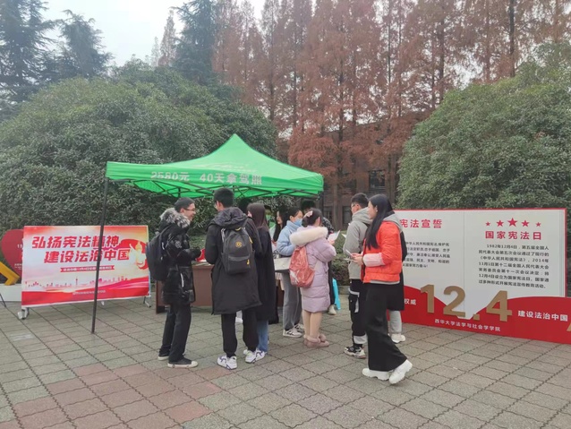 自11月30日起,西华大学各学院结合专业优势和实际情况,在线上线下开展了形式多样的宪法学习宣传活动。法学与社会学学院举办西华大学第三届宪法知识竞赛,并在学校明德广场开展了宪法宣传活动,现场为师生提供法律咨询服务,弘扬宪法精神,提高同学们对宪法知识的了解;外国语学院开展“明德崇法,笃行致知”宪法知识竞答活动及宪法普法活动,帮助学生在竞答和知识科普中了解《宪法》知识;能源与动力工程学院、建筑与土木工程学院、体育学院等组织学生积极参加第八届国家宪法日“宪法晨读”活动,在阅读中感悟《宪法》精神;经济学院组织学生观看全国青少年普法网网络直播,并利用早自习时间开展宪法晨读活动,感受宪法力量;应用技术学院开展升国旗仪式暨宪法晨读活动;西华学院依托“宪法卫士”活动载体,组织学生进行在线答题、考试,并将宪法知识与反诈防骗常识相结合,培塑学生法治精神;管理学院、理学院、电气与电子信息学院、计算机与软件工程学院、美术与设计学院、应急管理学院等召开学习宪法主题班会,在广大学生中营造积极学习宣传宪法,弘扬宪法精神,维护宪法权威的良好氛围。