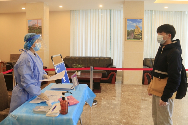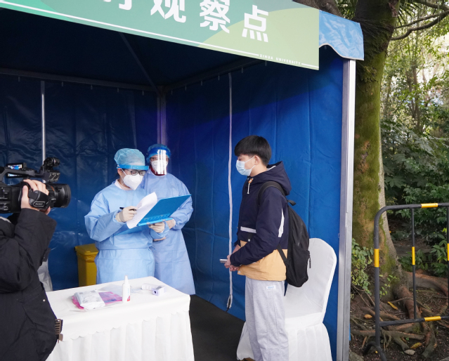 在学术交流中心,救护车把从定点医院做完核酸检测学生转运到这里进行集中隔离医学观察。学生来到集中隔离医学观察登记处,在通过工作人员核对基本信息、测量体温、登记相关信息、交代注意事项并签字后,扫码添加进“西华大学集中隔离医学观察联络qq群”,然后在工作人员引导下来到指定隔离房间进行隔离。工作人员在隔离房间门上安装门磁系统。演练整个过程高效、快捷、安全。西华大学医院副院长李红东对集中隔离医学观察演练进行了解说。