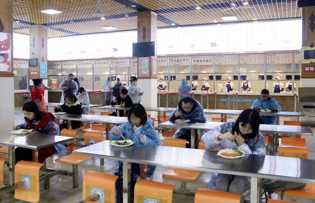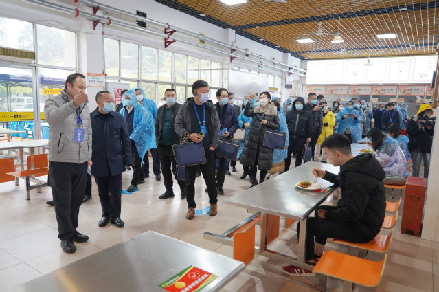 在学生一食堂,这里实行单进单出管理,入口处摆放着红外线测温仪,志愿者引导就餐师生配戴好口罩并依序进行体温检测后进入。食堂地面设有打餐导向标识,每条打餐通道用隔离杆隔离开,并设有一米间隔线,现场工作人员引导师生有序排队选餐。在应急管控期间,食堂增设打餐窗口,实施套餐制,采取多批次供菜,确需堂食的师生同向隔位就坐。现场保洁人员也对餐桌清理、打扫卫生和环境消杀进行了演练。后勤总公司副总经理刘俊对学生就餐演练情况进行了解说。