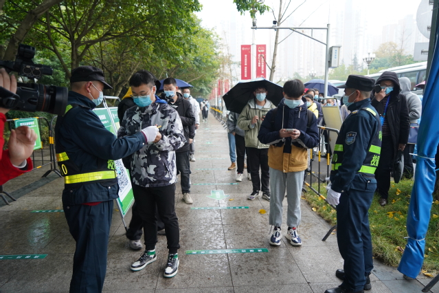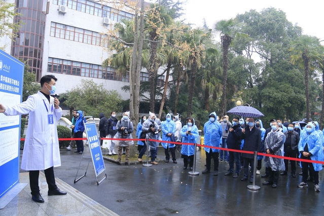 在明德广场,同学们积极配合工作人员的安排,全程佩戴口罩、利用身份证和天府通二维码依次进行身份认证和相关信息的网络录入,随后安静排队等待检测。医护人员穿着厚厚的防护服,分工明确、动作娴熟、认真细致、工作严谨,从手部消毒、拆封取样器、采取咽拭子、密封标本动作一气呵成。整个检测现场秩序井然、工作效率很高。学校团委书记张雯欣对核酸检测演练情况进行了解说。