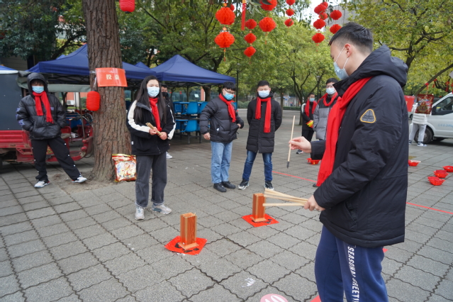 游园活动现场充满欢声笑语,活动包含掷飞镖、抖甩乒乓球、投壶、套圈、写春联、猜灯谜、踢毽子等项目,大家在游戏中感受年味,在欢笑中迎接新年。