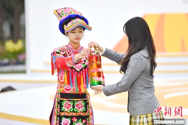 仪式现场,成都大运会火种灯正式亮相之后,金沙遗址博物馆馆长朱章义将火种灯传递给10位为成都大运会默默奉献的成都市民、大学生代表,共同将大运火种传递到主舞台上。
