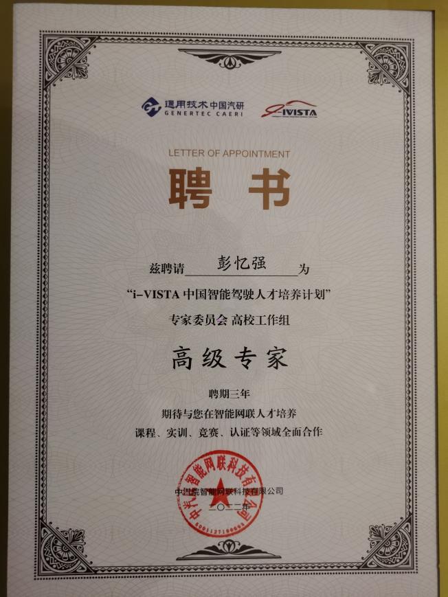 会议期间,彭忆强教授等高校专家还接受了“i-VISTA中国智能驾驶人才培养计划”专家委员会高校工作组高级专家证书,将在智能网联人才培养课程、实训、竞赛、认证等领域为我国智能驾驶人才培养工作全面开展提供支持。