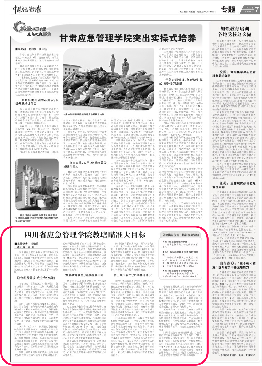 【中国应急管理报】3月11日以“四川省应急管理学院教培瞄准大目标”为题,对我校与四川省教育厅、四川省应急管理厅共建的“四川省应急管理学院”进行了报道。报道全文如下: